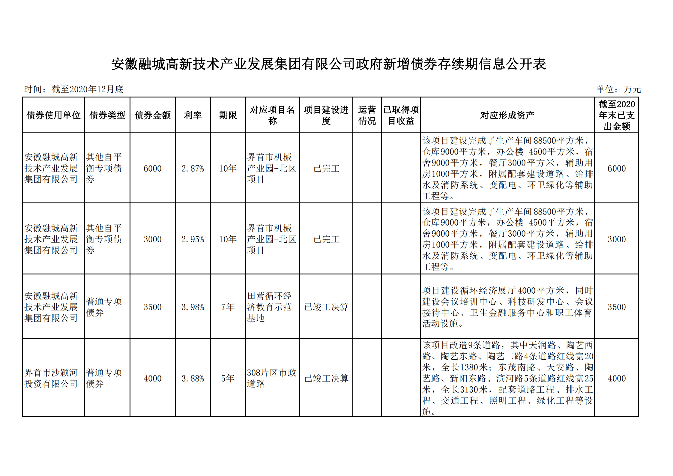 安徽融城高新技術產業發展集團有限公司政府債券存續期信息公開表