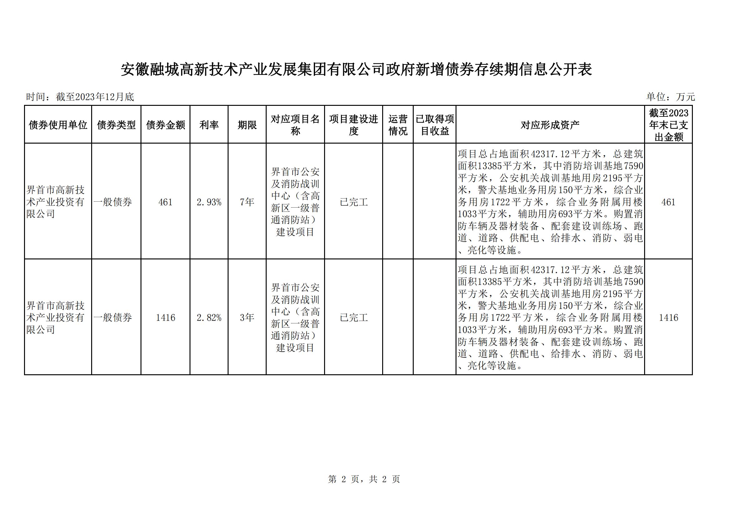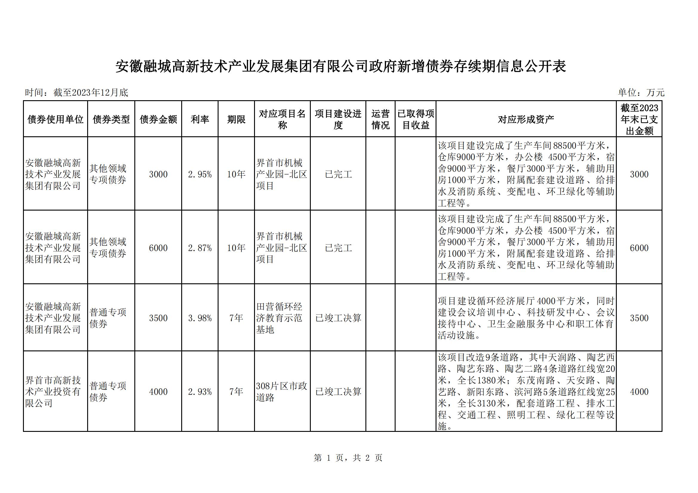 安徽融城高新技術產業發展集團有限公司政府新增債券存續期信息公開表